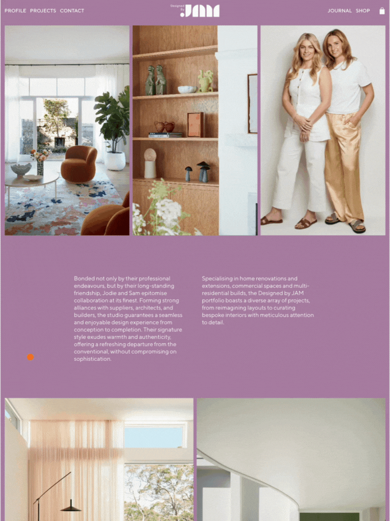 We designed and developed Designed by JAM’s website from top to bottom, crafting a seamless user experience that presents their projects engagingly and intuitively. We also integrated their product collection throughout the site, ensuring a natural flow from content to e-commerce, and introduced a product shop, enabling customers to make pre-sale purchases directly through the website. Drawing inspiration from design and e-commerce trends within the industry, we carefully clocked how similar businesses showcased their work and identified ways to make their unique branding truly pop. The result? An energetic, functional website that perfectly reflects the personalities of co-owners Jodie & Samantha. Because the people who design dream homes deserve a dream website of their own.